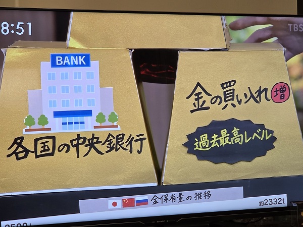 さて、昨日は、TBS系「サンデーモーニング」で金特集。「古い金ジュエリー売って大儲け」のパターンではなく、まともに金についての説明を試みていた。筆者のコメントもまともに紹介されていた。地上波の視聴者の多くは、金に関しての知見が著しく低いので、相変わらず、「プール4杯分」の話から入った。