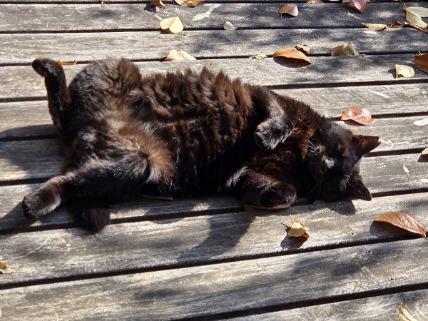 今日の写真は、季節外れの暖かさで、ベランダに無防備な状態で寝そべる猫ちゃん。
