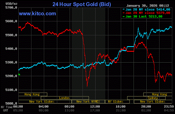 昨晩、国際金価格がNY市場で5,500ドルを超えたところで、ストンと相場が落ち、瞬間的に5,100ドル台!に暴落した。(KITCOグラフ、赤線)