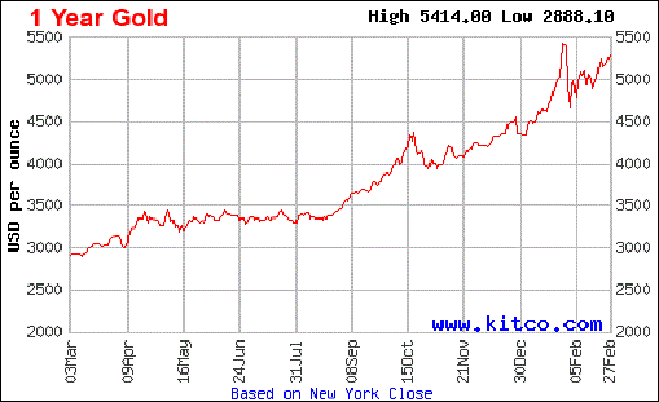 今週は、雇用統計など労働関連指標発表が相次ぐので、中東ばかりに目を奪われていると、思わぬところで、足をすくわれるリスクがある。とにかく、5,300ドルというのは、歴史的に信じられないほどの高値圏。(下記の1年金価格グラフ参照)。