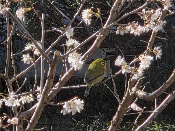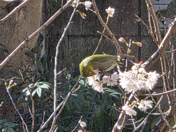 最後は、気分を変えて、我が家のサクランボの木で花をつっつくメジロ。