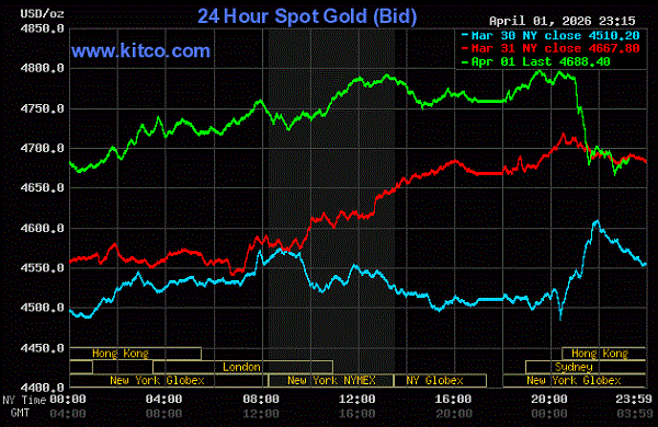 金価格に関しては、イラン停戦近しの観測と原油安で4,700ドル台まで、買い戻され、中期的上値抵抗線の4,800ドルに挑戦!というタイミングで、頭を叩かれた。(KITCOグラフ緑線)